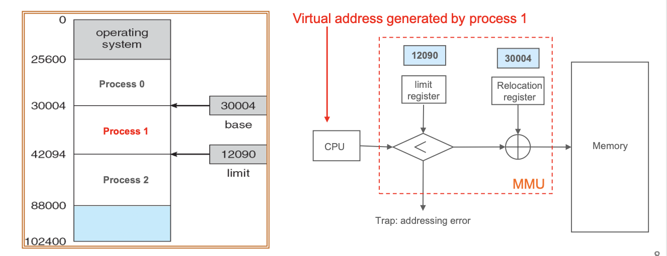 1. Relocation Register(or Base Register) : 현재 실행 중인 프로세스가 접근할 수 있는 가장 작은 물리 주소를 저장한다.