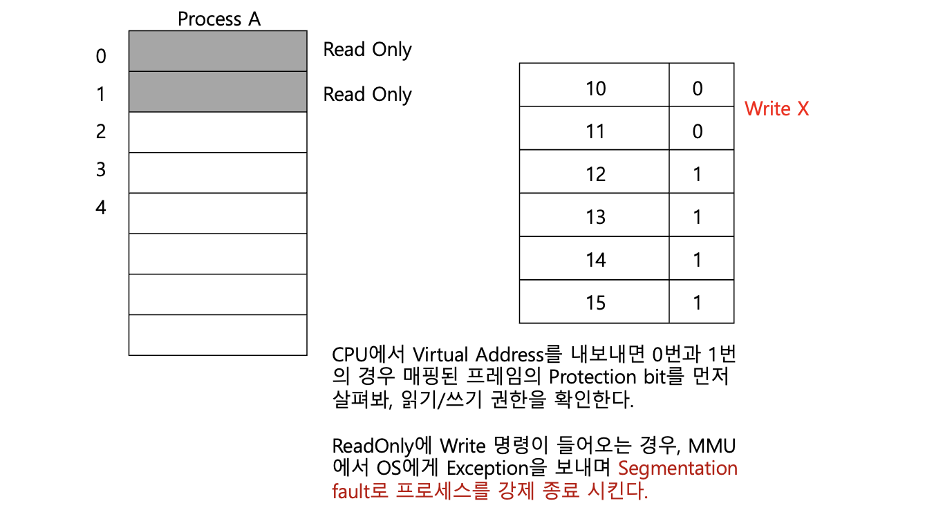운영체제는 단순히 주소를 매핑하는 것에 그치지 않고, 각 페이지에 대해 읽기/쓰기 권한을 지정할 수 있다. 이를 위해 페이지 테이블 항목마다 보호 비트(Protection Bit)를 함께 저장한다.