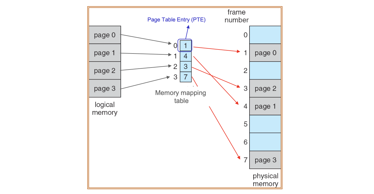 MMU는 페이지 번호를 이용해 페이지 테이블에서 해당 페이지에 대응하는 프레임 번호를 찾고, 여기에 오프셋을 더해 최종 물리 주소를 계산한다.