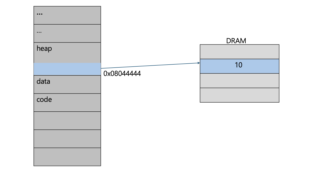 위 코드처럼 malloc을 통해 heap 영역을 사용하는 경우 heap 영역은 DRAM과 매핑이 되어있으므로, 매핑되어 있는 frame에 10을 저장한다.