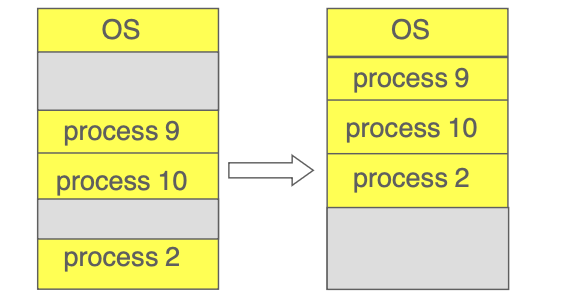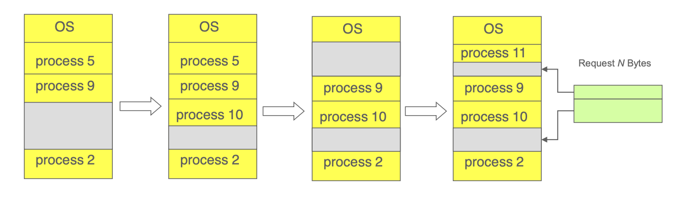 압축(Compaction) : 메모리의 내용을 재배치하여 빈 공간을 한 곳으로 모은다. 하지만, Compaction 시에 엄청난 Copy 오버헤드가 발생하여 성능이 떨어진다.
