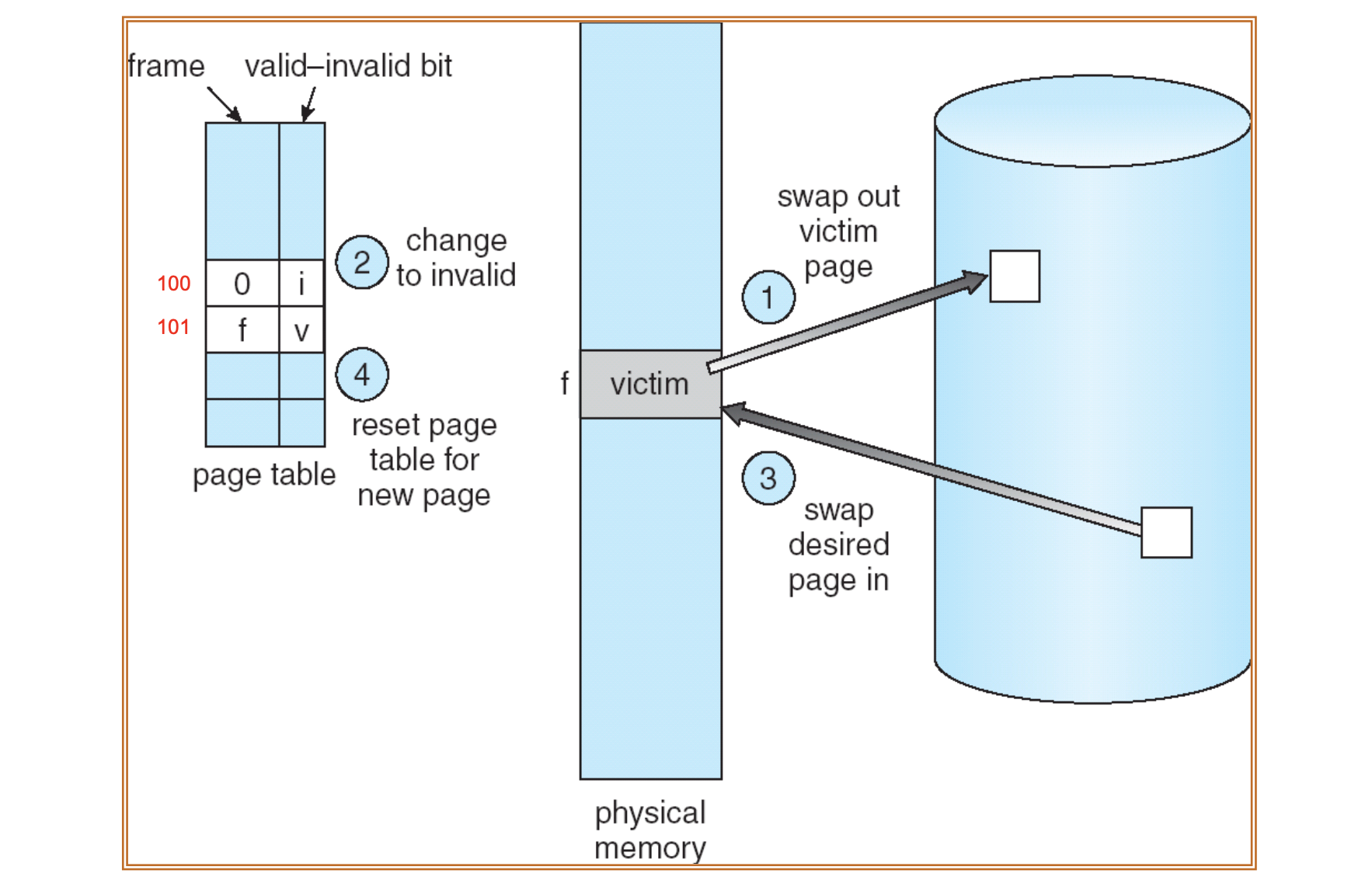 4. 페이지 테이블을 갱신하여, 교체된 페이지를 "유효하지 않음" 상태로 표시하고, 새로 적재한 페이지를 "유효" 상태로 설정한다.