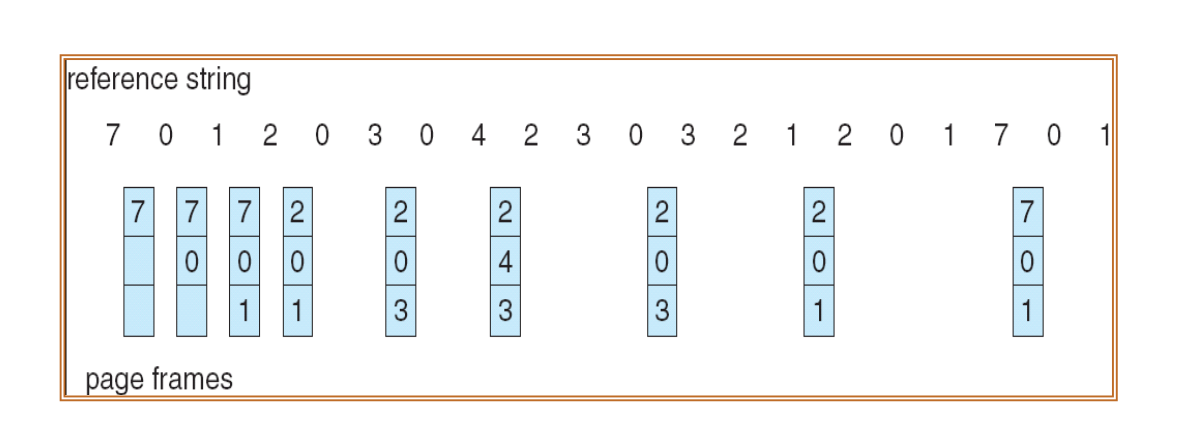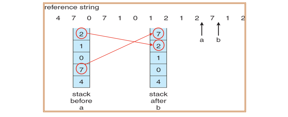 - 스택 방식 : 페이지를 스택으로 관리하여 참조 시마다 가장 위로 올린다(가장 위에가 가장 최근에 사용된 페이지). 가장 아래에 있는 페이지가 교체 대상이 된다.