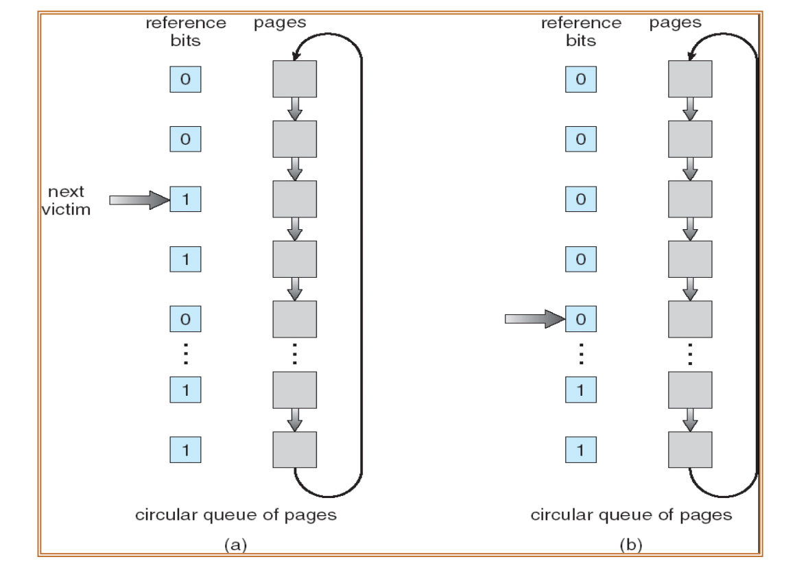 이 과정을 반복하면서 결국 참조 비트가 0인 페이지를 찾을 때까지 진행된다.