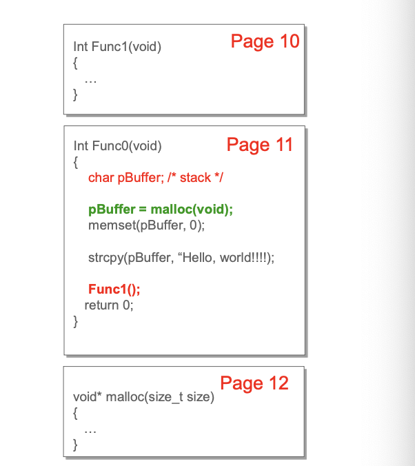 이 코드 실행 동안 페이지 10(스택), 11(함수 코드), 12(malloc, memset 등)이 함께 사용되며, 이들이 메모리에 없다면 연속적으로 페이지 폴트가 발생하게 된다.