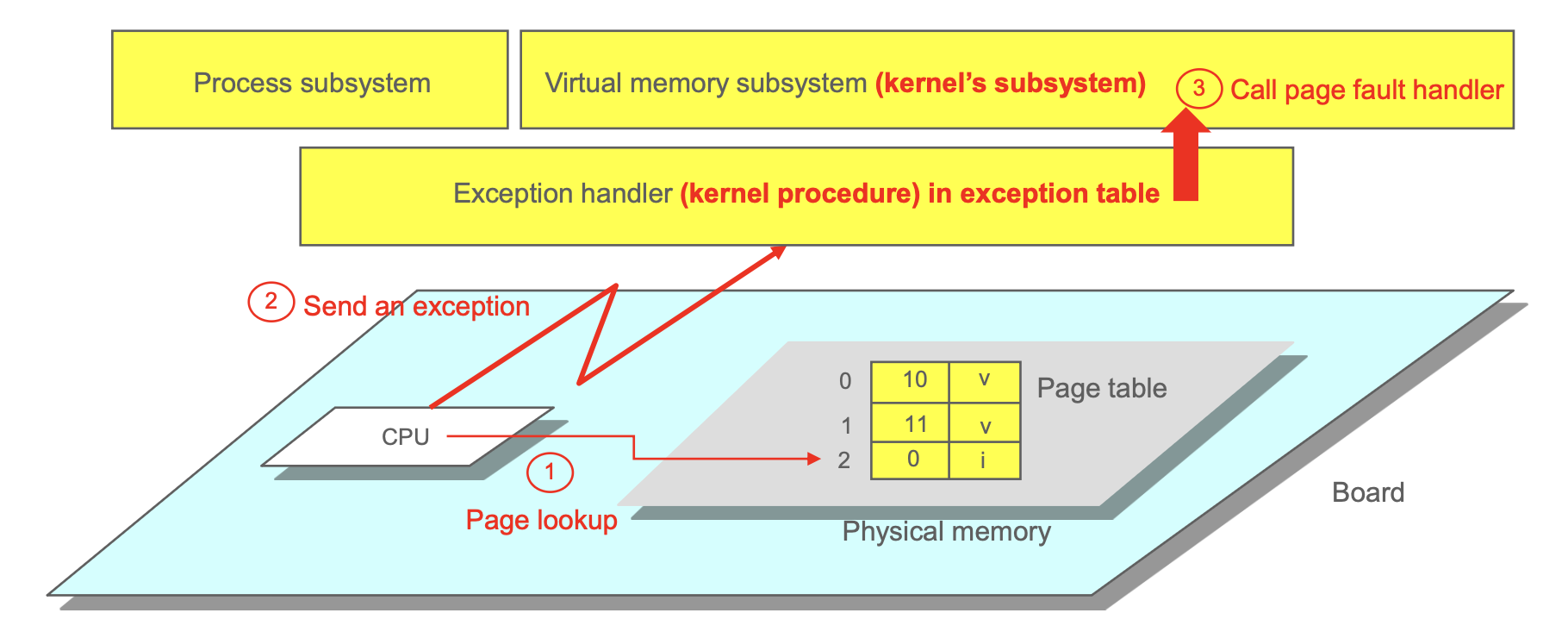 페이지 폴트가 발생하면, 하드웨어(MMU, 메모리 관리 유닛)는 이를 감지하고 예외(Interrupt)를 발생시킨다. 이 예외는 커널로 전달되며, 운영체제는 해당 프로세스를 일시 중단시키고 페이지 폴트 핸들러라는 특수한 예외 처리 루틴을 수행한다.
