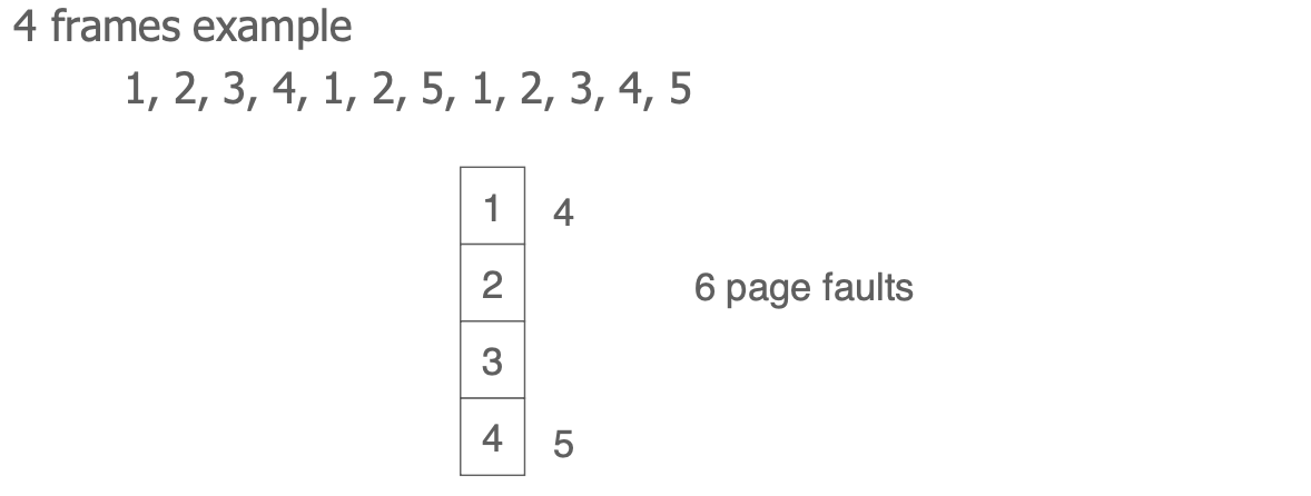 단점 : 오래된 페이지가 아직도 활발히 사용되는 경우에도 교체 대상이 되어, 실제 성능이 낮아질 수 있다. 이러한 현상을 Belady의 이상(Belady's anomaly)라고 한다.