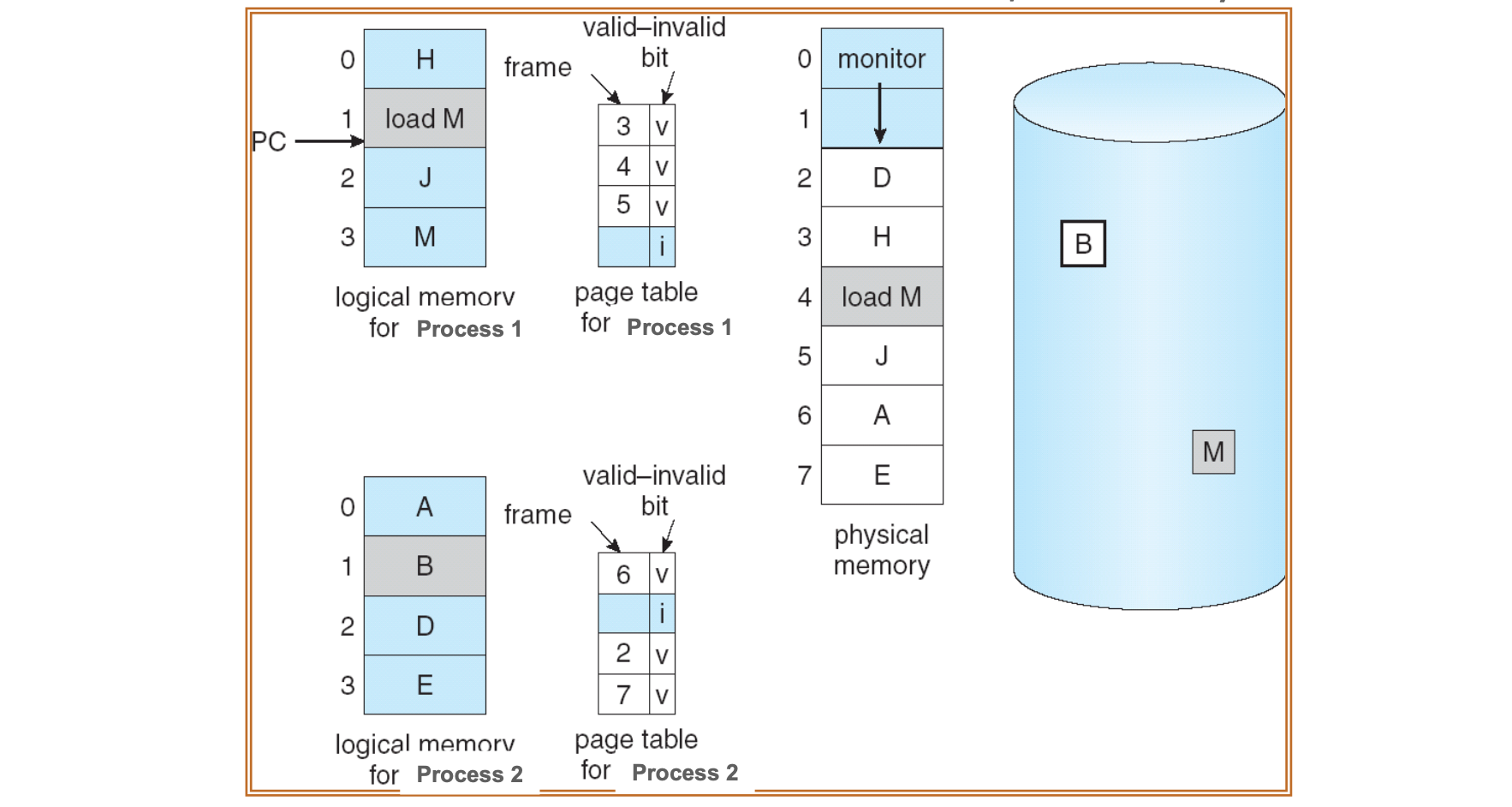 이때 페이지 폴트가 발생하고, 운영체제는 디스크로부터 해당 페이지를 메모리의 빈 프레임에 적재한다.