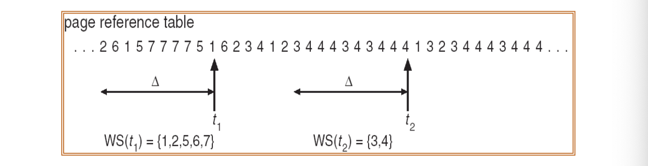 Δ = 10인 경우, 시간 t1에서의 워킹셋이 {1, 2, 5, 6, 7}이라면, t2로 시간이 지나면서 워킹셋이 {3, 4}로 바뀔 수 있다. 이는 프로그램의 지역성이 시간에 따라 변화함을 나타낸다.
