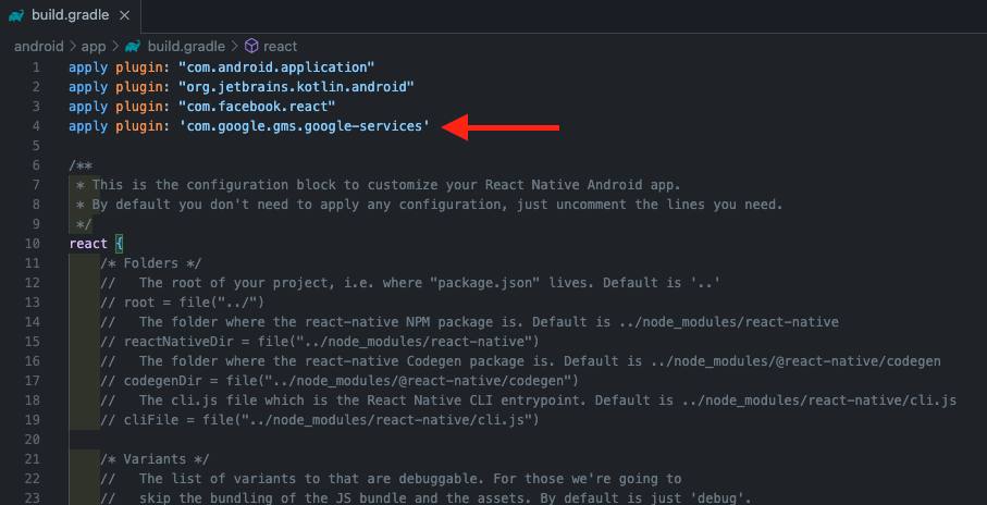마지막으로 /android/app/build.gradle 최상단에 코드를 추가해줍니다.