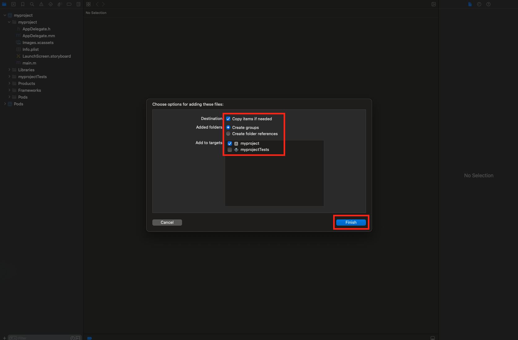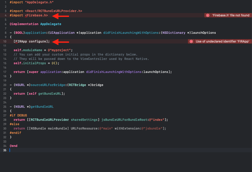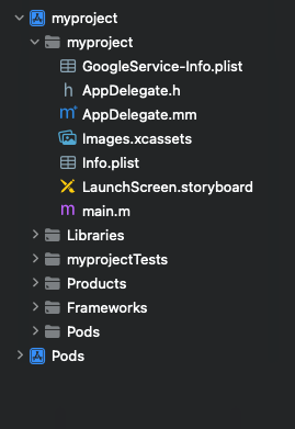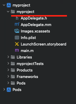 파일이 정상적으로 들어갔다면 AppDelegate.mm 파일을 열어주고 코드를 입력합니다.