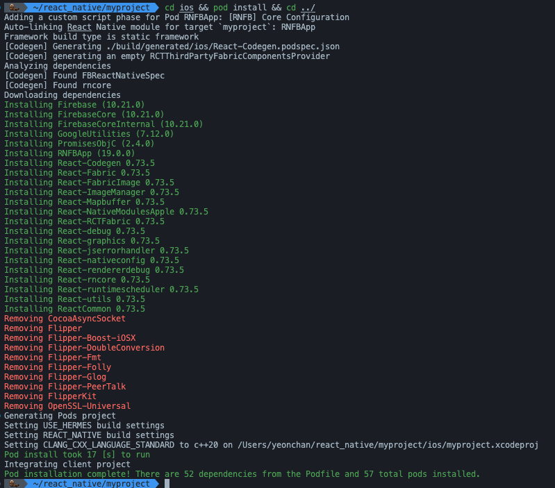 마지막으로 react native 프로젝트의 ios 폴더안에서 pod install 을 통해서 설치를 해줍니다.
