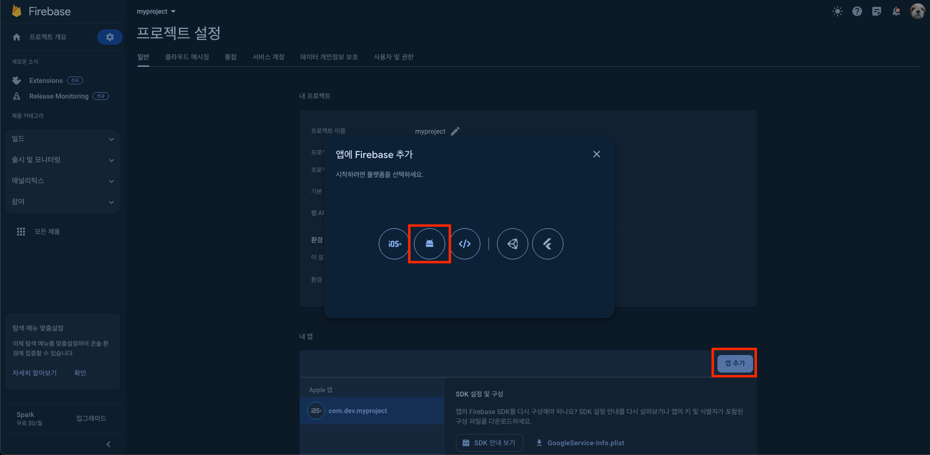 안드로이드도 마찬가지로 프로젝트 설정에서 앱 추가를 눌러주고 안드로이드 아이콘을 눌러줍니다.