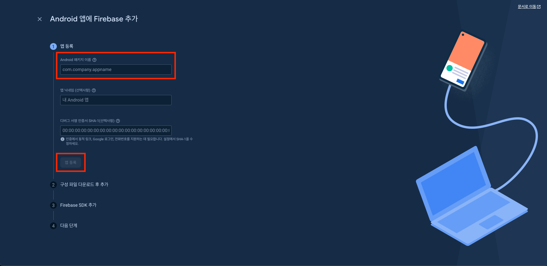 Android 패키지 이름에 안드로이드 패키지명을 입력해주고 앱 등록을 눌러줍니다.