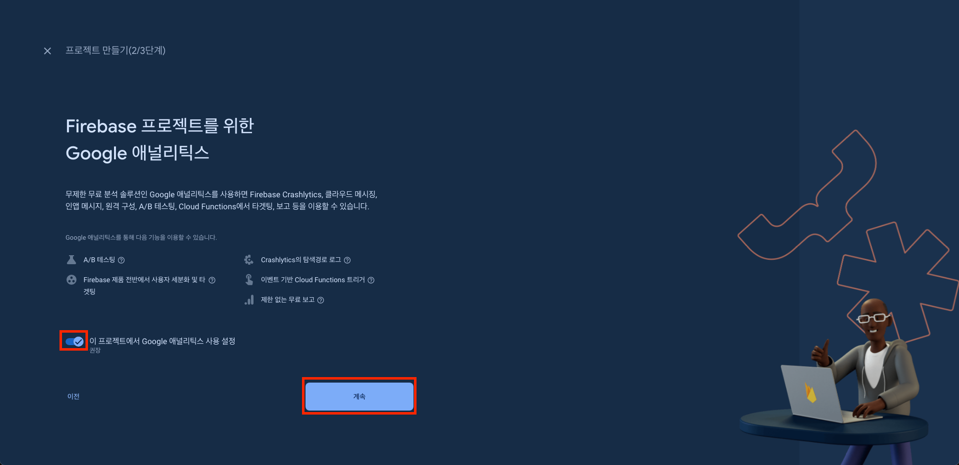 Google Analytics를 사용하신다면 체크를 해주시고 계속을 눌러줍니다.(선택사항)