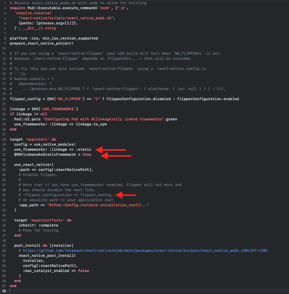 또한 frameworks를 사용하면 flipper를 사용하지 못하므로 flipper_configuration 라인을 주석 처리해줍니다.