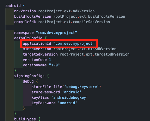 프로젝트에서app폴더안의build.gradle파일을 확인하면applicationId에 패키지명이 있습니다.