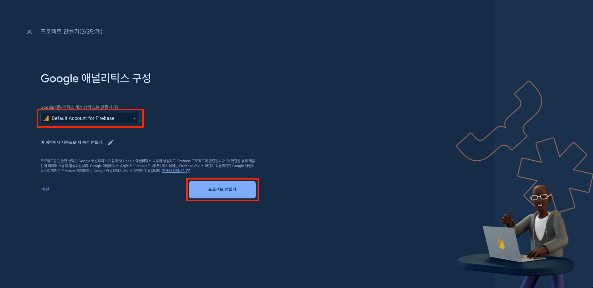 Google Analytics를 선택하셨다면 기본 계정을 선택해주고 프로젝트 만들기를 눌러주며 프로젝트를 생성합니다.