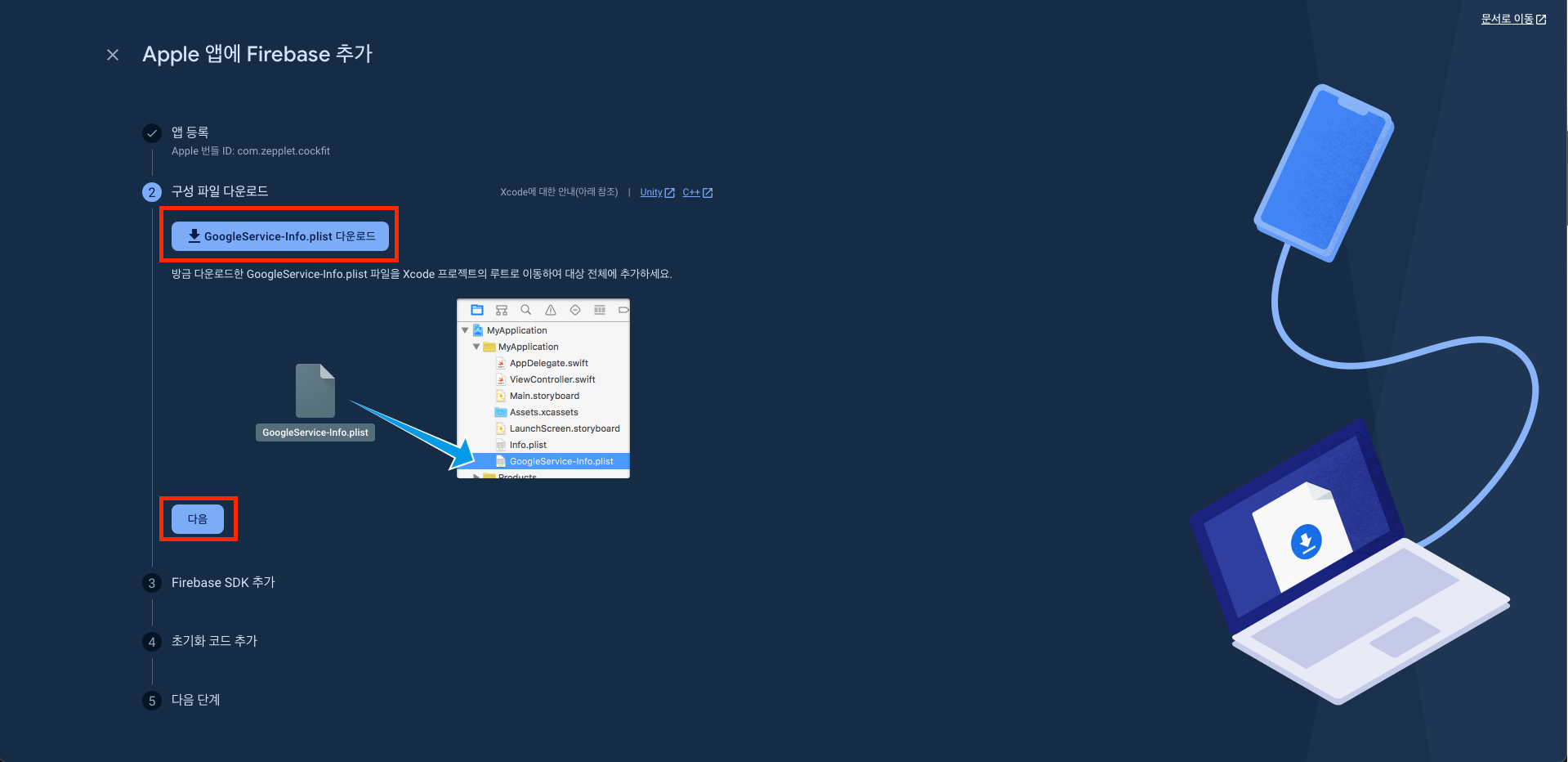 GoogleService-Info.plist 파일을 다운받고 다음을 눌러줍니다.