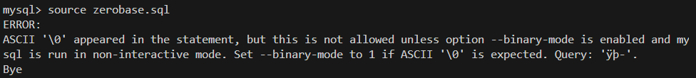 ASCII '\0' appeared in the statement, but this is not allowed unless option --binary-mode is enabled and mysql is run in non-interactive mode. Set --binary-mode to 1 if ASCII '\0' is expected. Query: 'ÿþ-'.