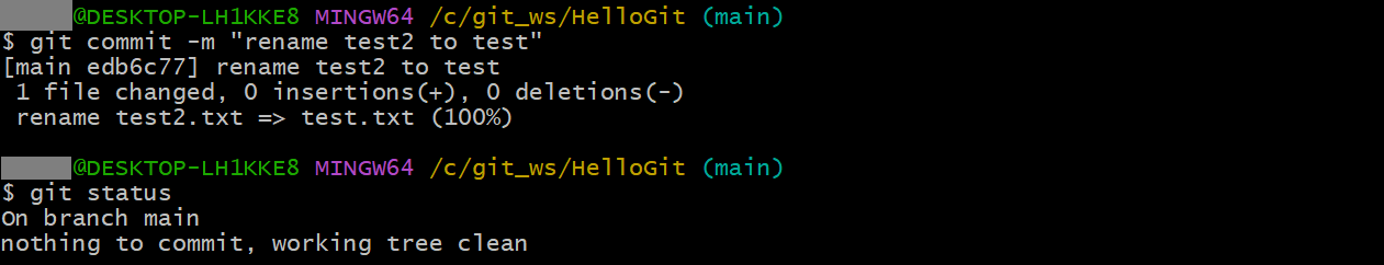 git commit -m "rename test2 to test"