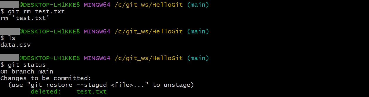 git rm 이 아니라 터미널 명령어 rmrm test.txt