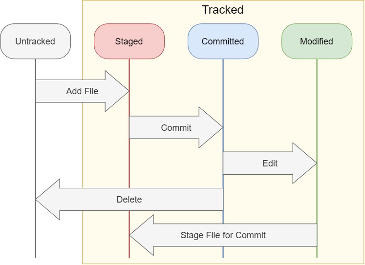 Untracked(git에 등록되지 않은 상태) vs Tracked(등록된 상태)Staged : Commit을 할 수 있는 후보 상태Committed(Unmodified) : 버전이 매겨진 상태Modified(UnStaged) : 버전이 매겨진 파일이 수정된 상태, Staged 도, Committed 도 아닌 상태상태 변화
