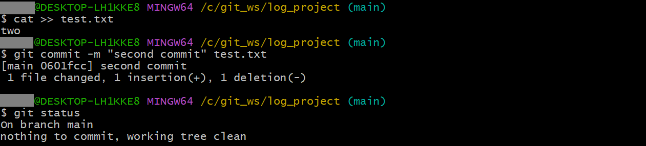 git commit -m "second commit" test.txt
