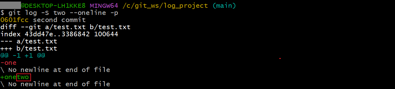 git log -S two --oneline -p