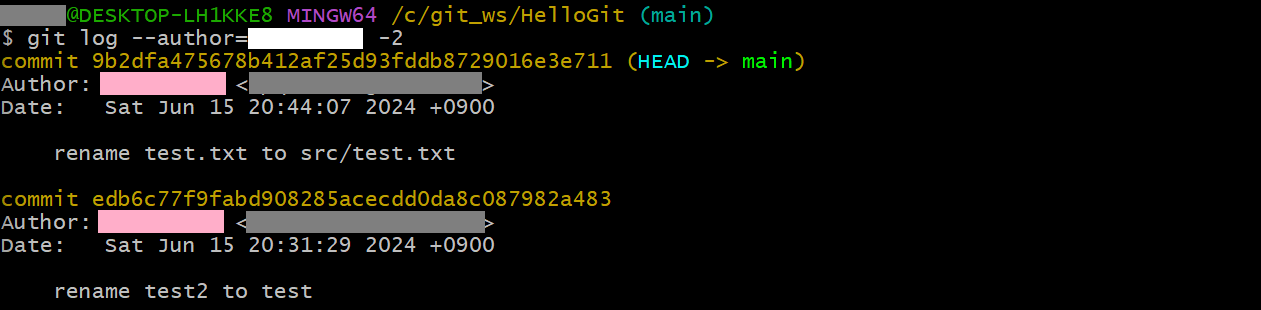 git log --author=<user_name OR user_email> -<개수>