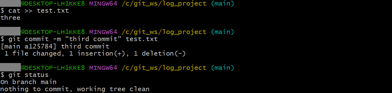 git commit -m "third commit" test.txt