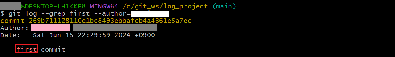 git log --grep first --author=<user_name>