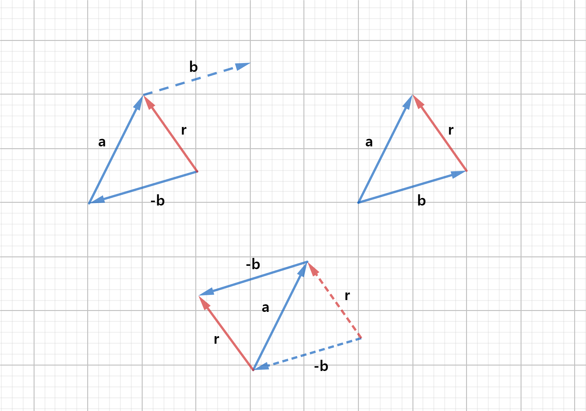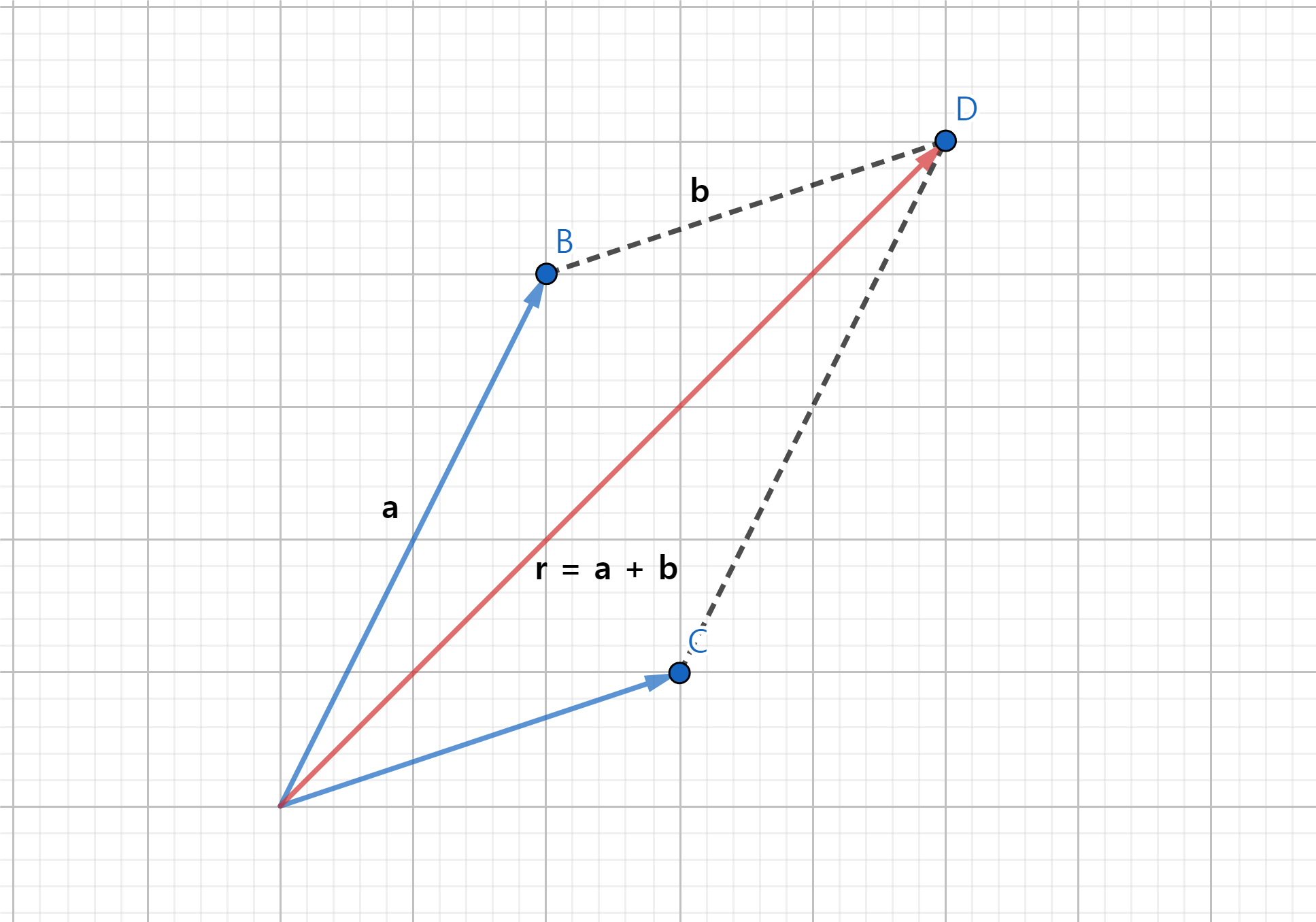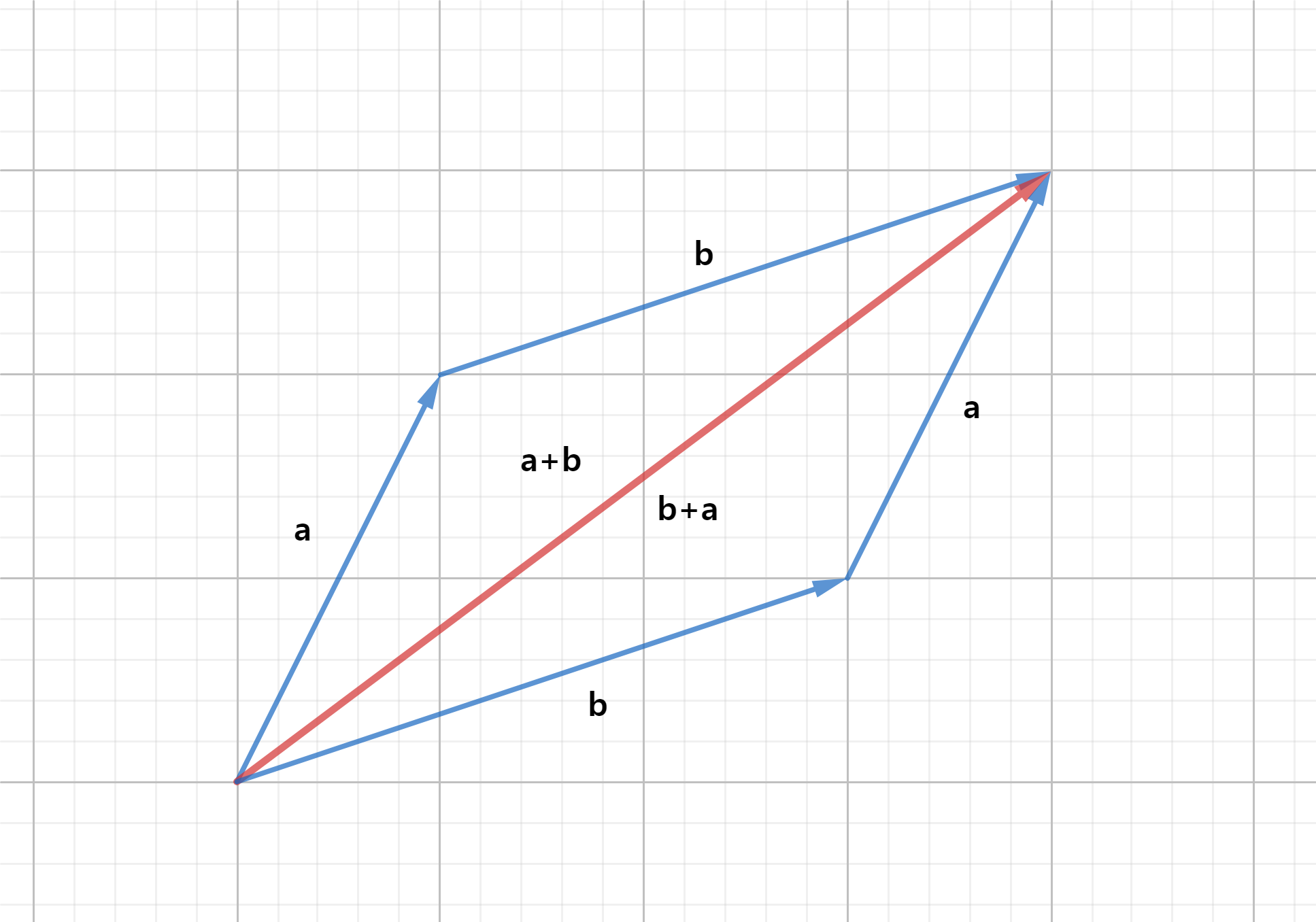 꼬리를 일치 시킨 후, 두 벡터를 인접한 두 변으로 평행사변형을 그렸을 때, 두 벡터의 꼬리에서 시작하는 평행사변형의 대각선이 a와 b의 합벡터에 해당됨