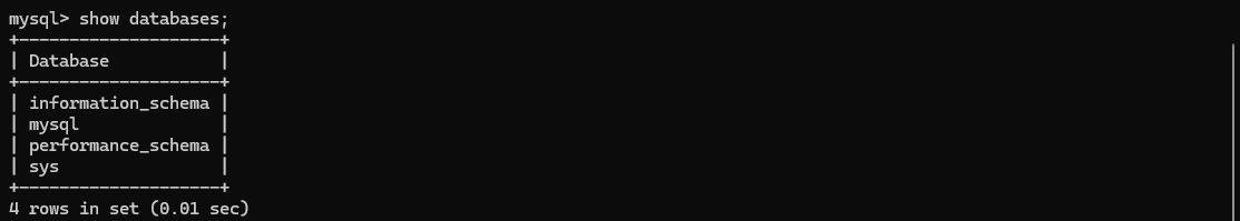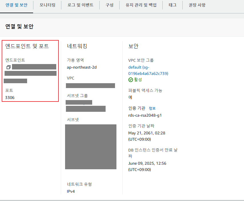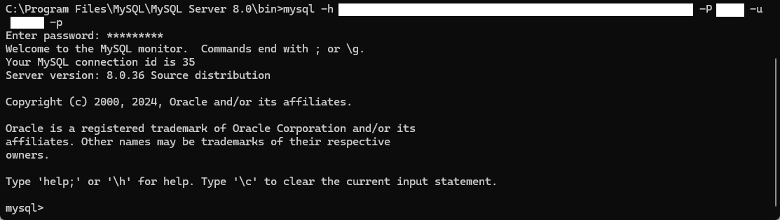 C:\Program Files\MySQL\MySQL Server 8.0\bin>mysql -h 엔드포인트 -P 포트 -u 마스터사용자이름 -p