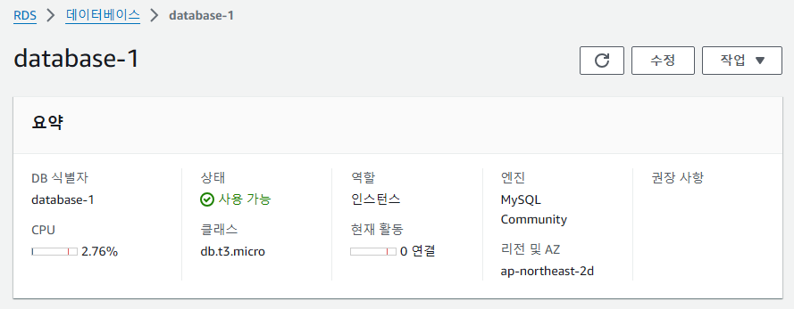 서비스 / RDS / 데이터베이스 - database-1 선택