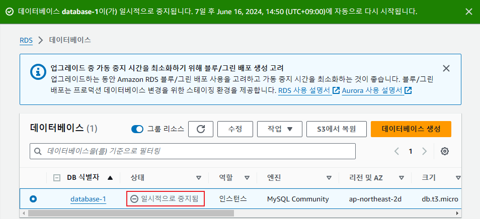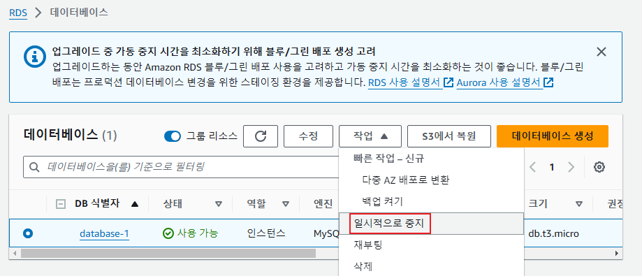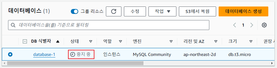서비스 / RDS / 데이터베이스 - database-1 체크