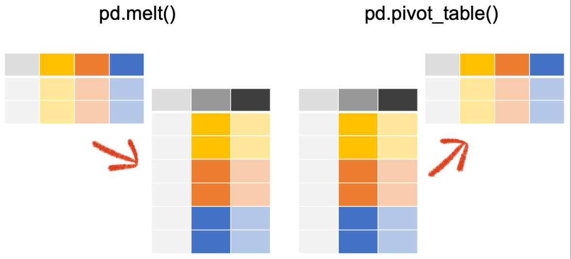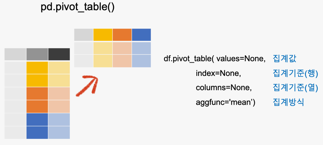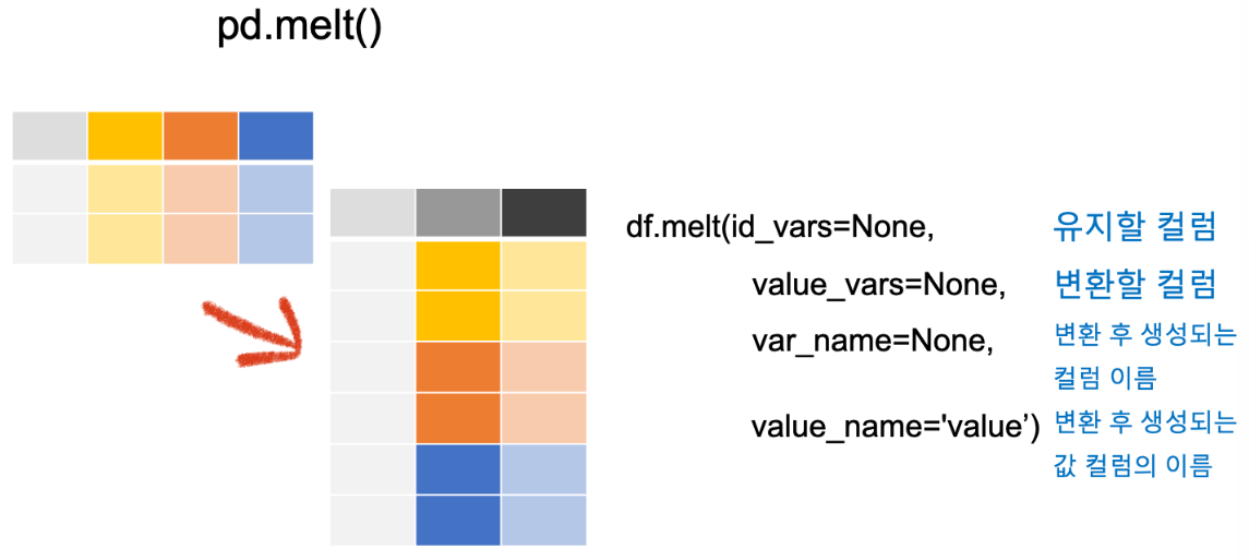 pd.melt() : 집계된 형태를 다시 세로로 길게 만들어주는 함수pd.pivot_table() : 엑셀의 pivot 테이블과 통일, 세로 형태를 가로 형태로 전환