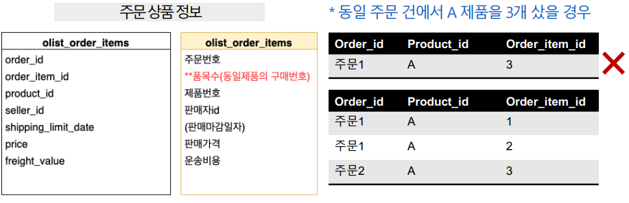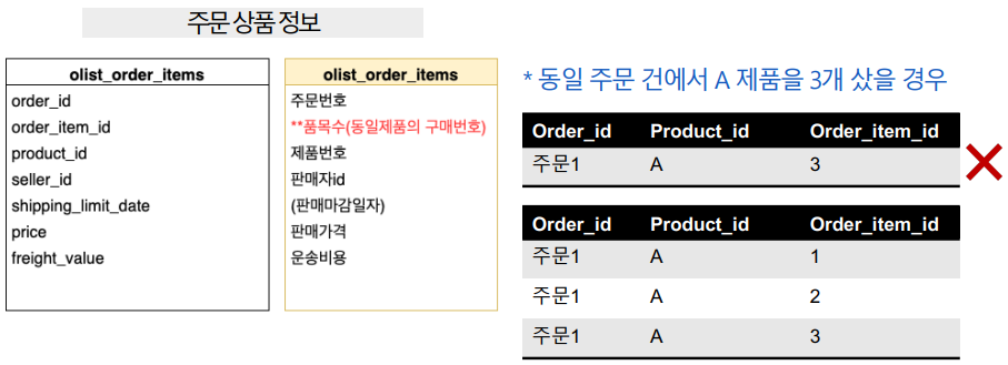 Customer_id는 매 주문건마다 새로 생성됨order_item_id는 주문건 내 동일 상품이 있는 경우 증가함