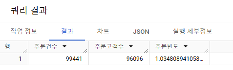 COUNT(DISTINCT order_id) / COUNT(DISTINCT customer_unique_id) AS `주문빈도`