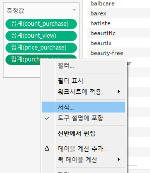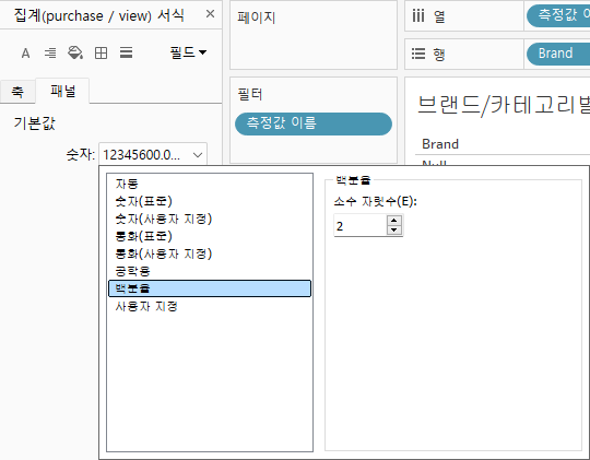 - 집계된 필드 우클릭 → 서식 → 백분율로 변경