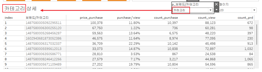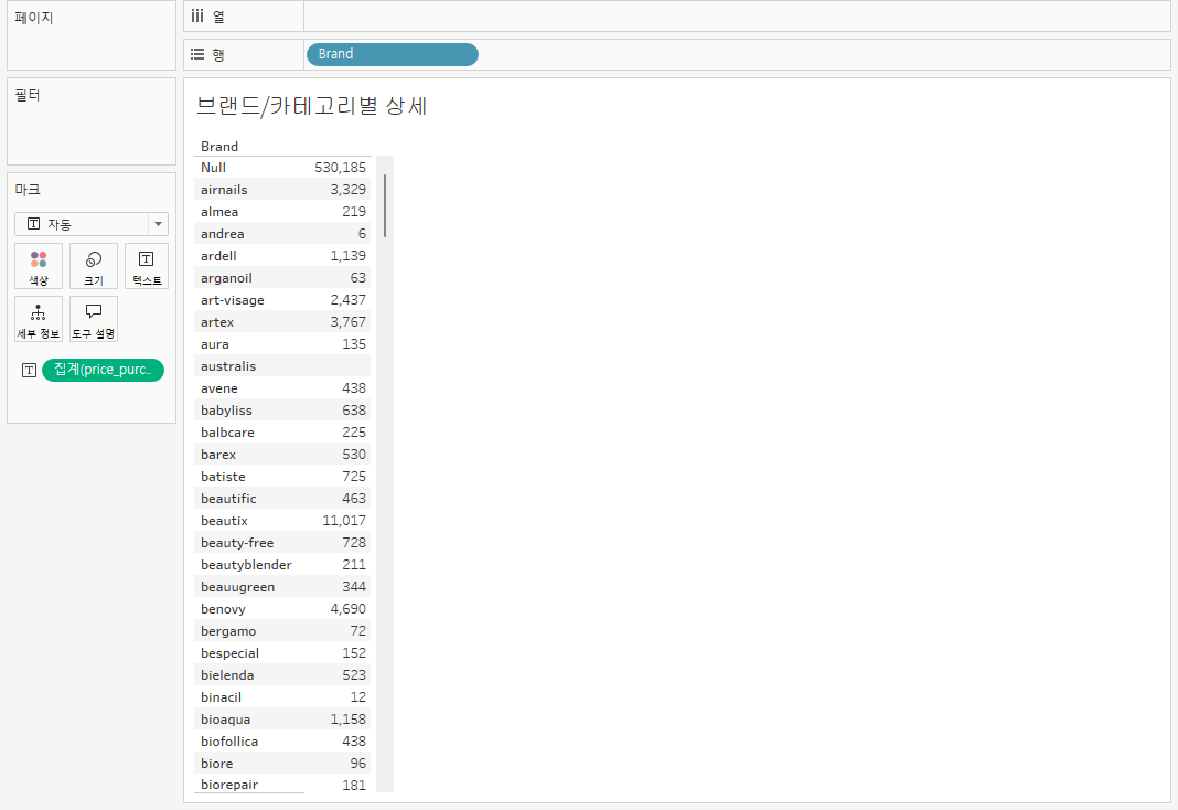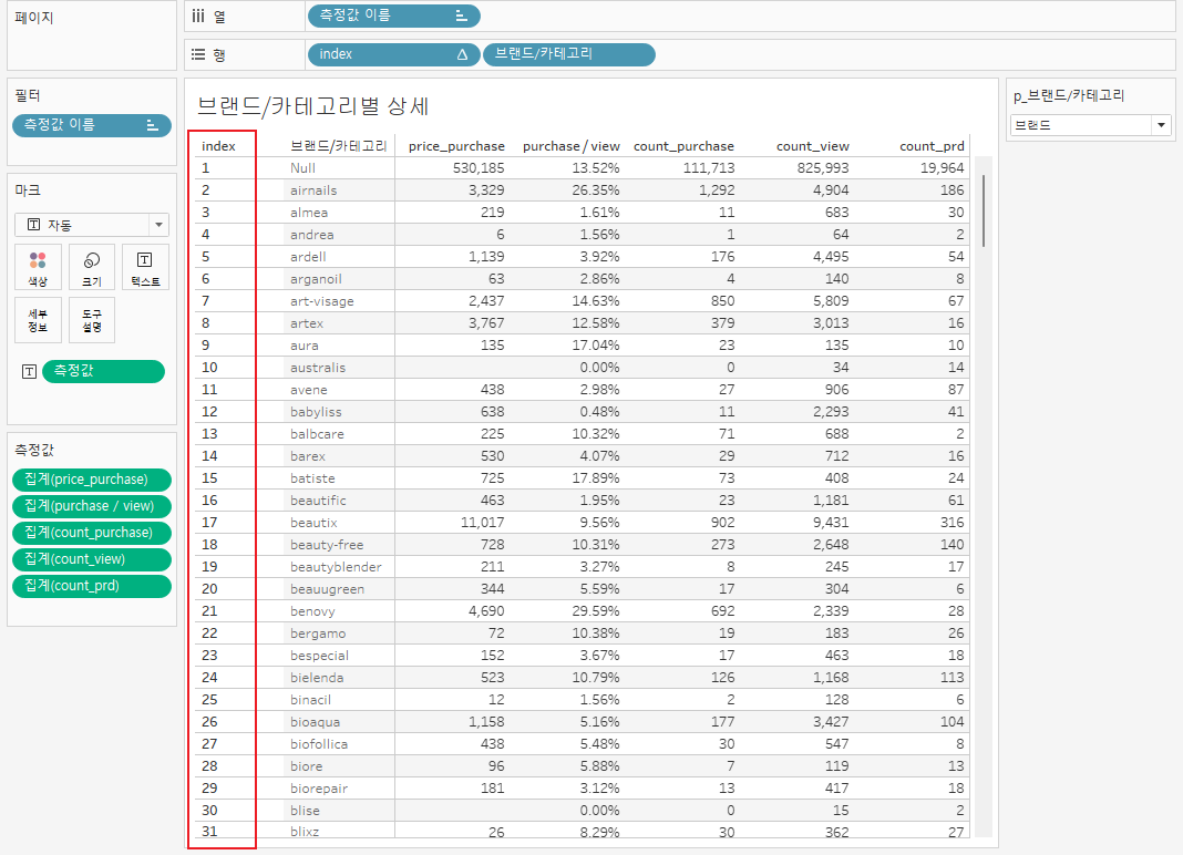 - 브랜드/카테고리 필드명 우클릭 → 정렬 선택