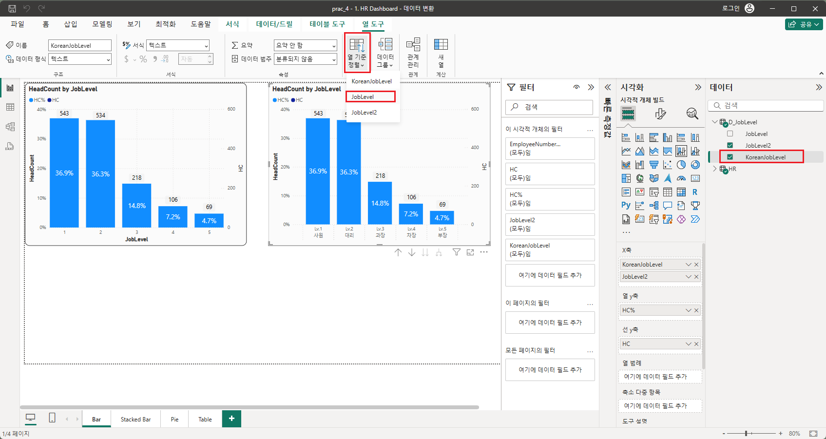 🔆 컬럼 선택 → 열 도구 탭 → 열 기준 정렬