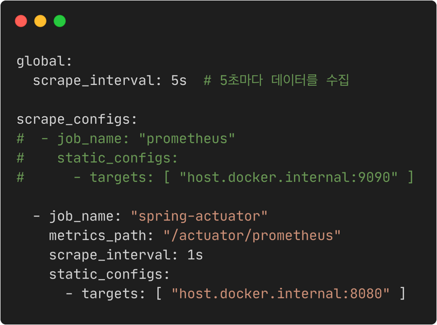 위의 프로젝트 구조에서 보신 것처럼 Spring Boot는 로컬 노트북에서, Prometheus와 Grafana는 Docker 환경에서 실행되기 때문에 localhost:8080으로 작성을 하면 컨테이너 내부의 8080 포트로 인식하게 됩니다.