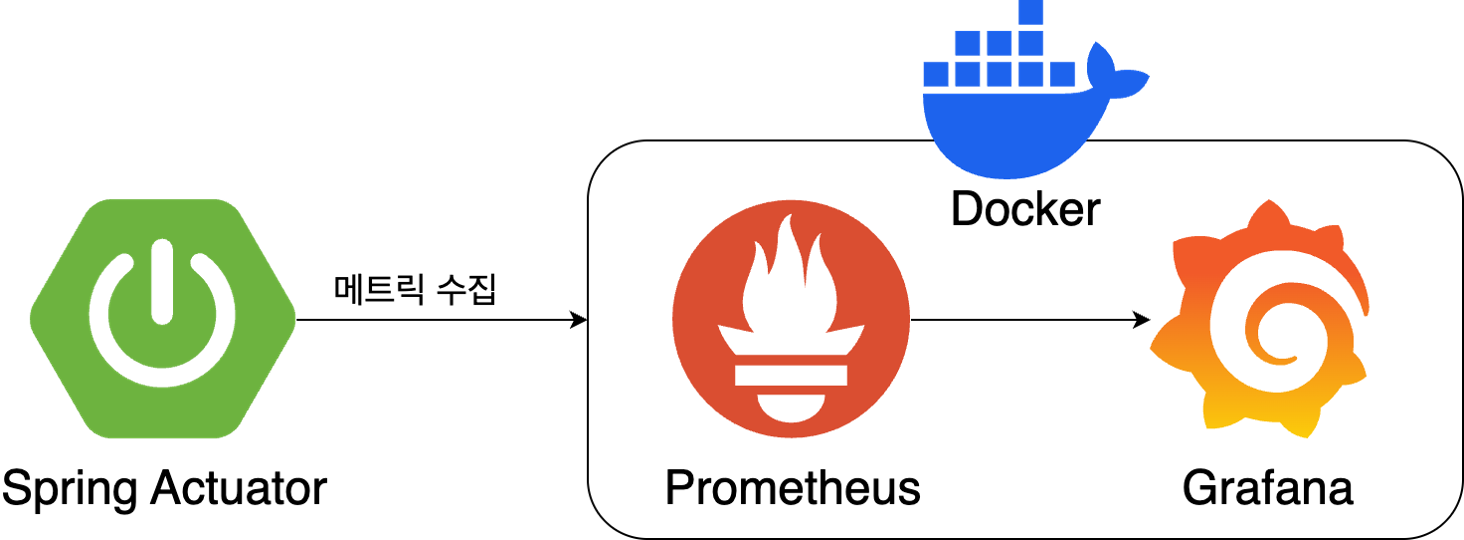Spring Boot 프로젝트에 Spring Actuator를 추가하여 수집한 메트릭을 Prometheus로 전달합니다. Prometheus에서 수집한 데이터들을 Grafana로 전달하여 시각화 하는 방식입니다.