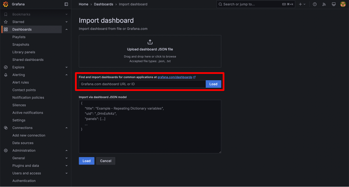 원하는 대시보드를 선택하고 해당 ID를 작성한 후 Load를 눌러줍니다.