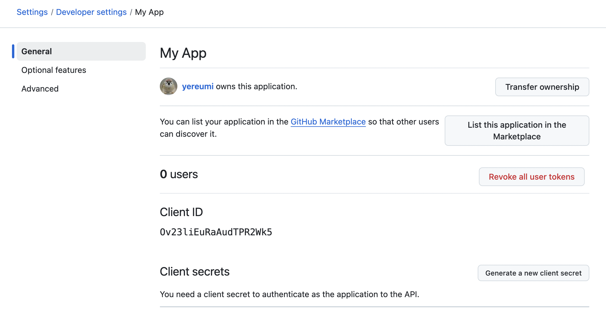 등록하면 다음과 같은 화면이 보이는데, Generate a new client secret 버튼을 눌러 Client secrets을 생성합니다.