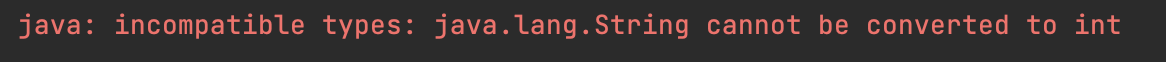 다음과 같은 에러가 발생한다. 위 에러는 타입 불일치 내용을 포함하고 있다. 즉, 코드에서 String 타입을 int 타입으로 변환하려고 했는데, Java에서는 자동으로 변환하지 않기 때문에 발생하는 오류이다.