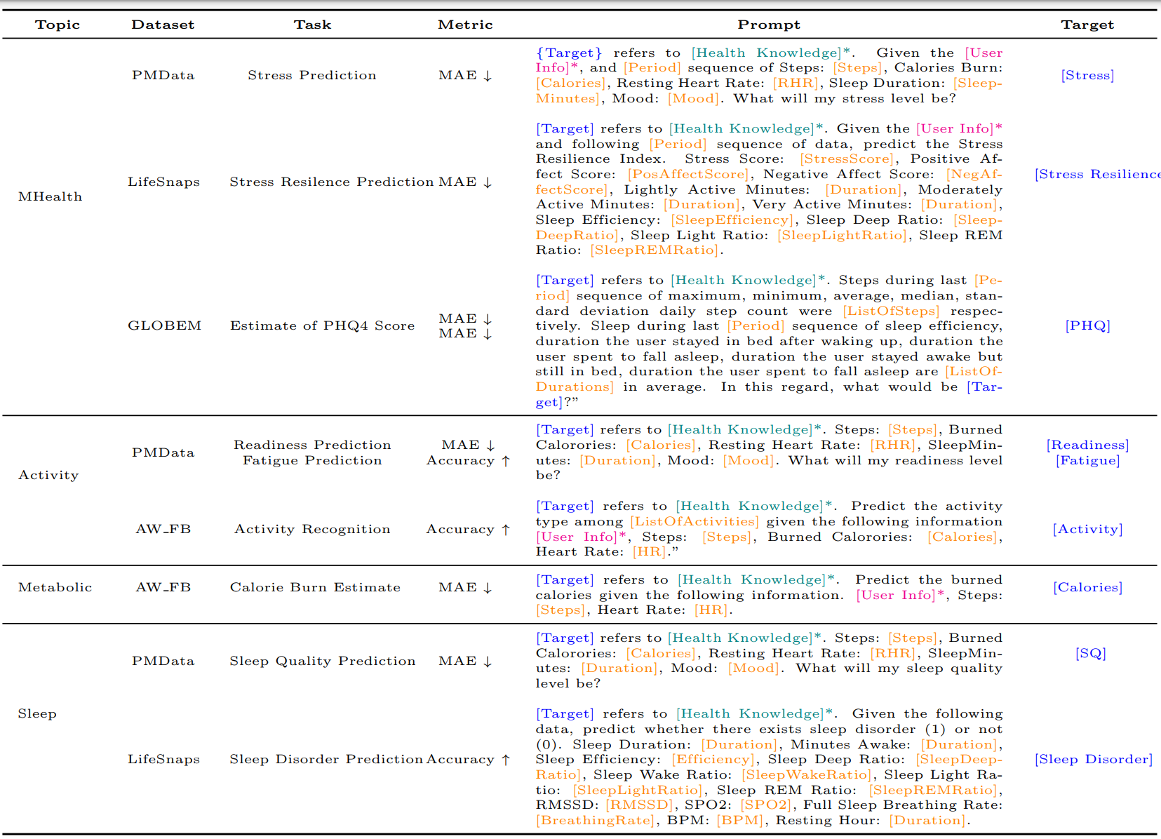 - 각 데이터셋에서 스트레스 예측, 수면 장애 탐지, 준비 상태 평가, 피로도 모니터링, 칼로리 소모량 추정 등의 작업을 정의하여, 총 10개의 건강 관련 예측 작업 수행