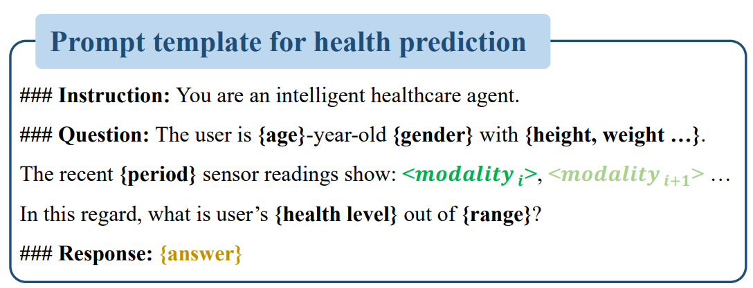 어플, 웨어러블, 서베이, 기관 등으로부터 멀티모달 데이터를 받아온다고 가정하는 컨셉 기반 연구로 소스들로 어떻게 데이터를 받아오고, 다양한 형태의 데이터를 어떻게 처리해 llm에 입력할 것인지에 대해 다루고 있지는 않습니다