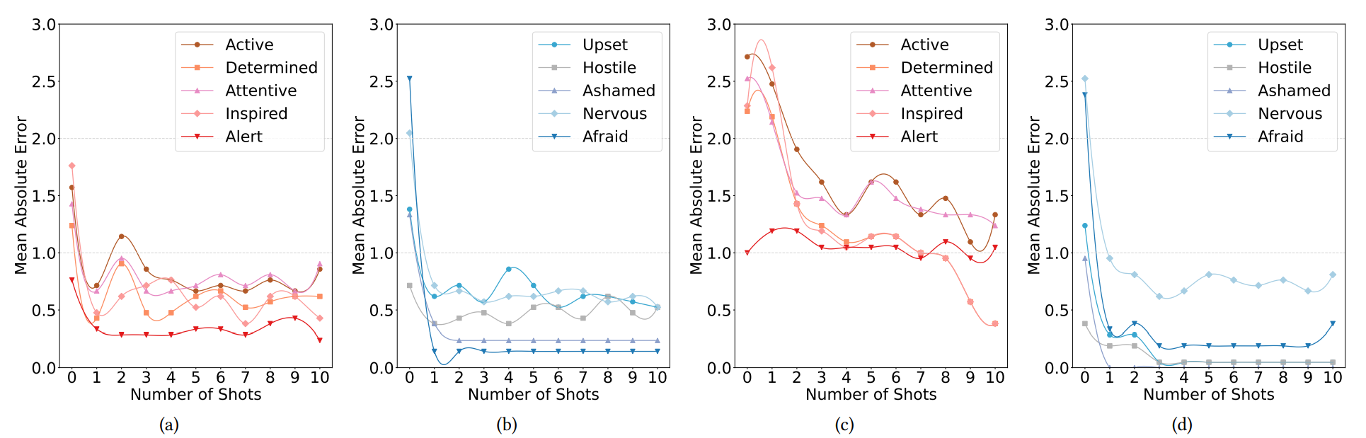 1샷에서 뚜렷한 성능 향상, 샷 수가 증가할수록 감정 예측 성능(MAE)이 전반적으로 향상됨
